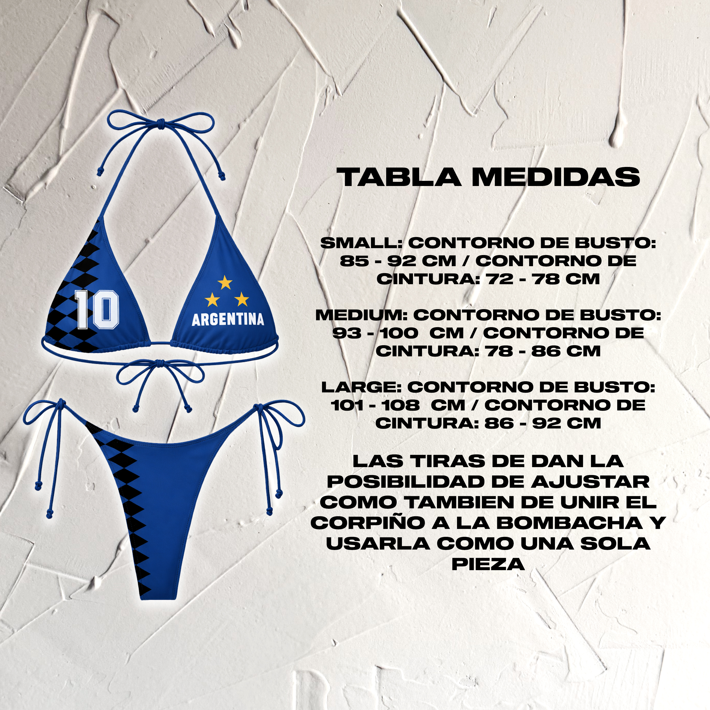 Tanto el corpiño como la bombacha tienen tiritas, para que puedas atarla al cuello y al bajo busto en el caso del corpiño y a la cintura en el caso de la bombacha.